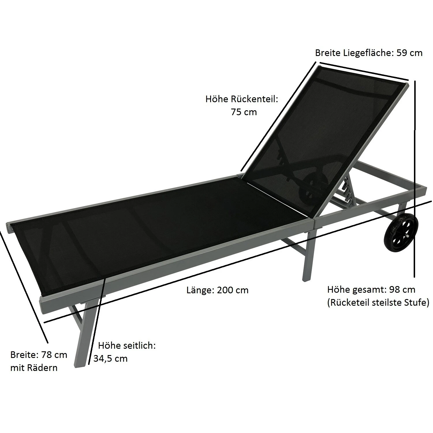 Wetterfeste Sonnenliege OSTIA mit Rollen, Gestell Aluminium, Bespannung Kunstgewebe schwarz.