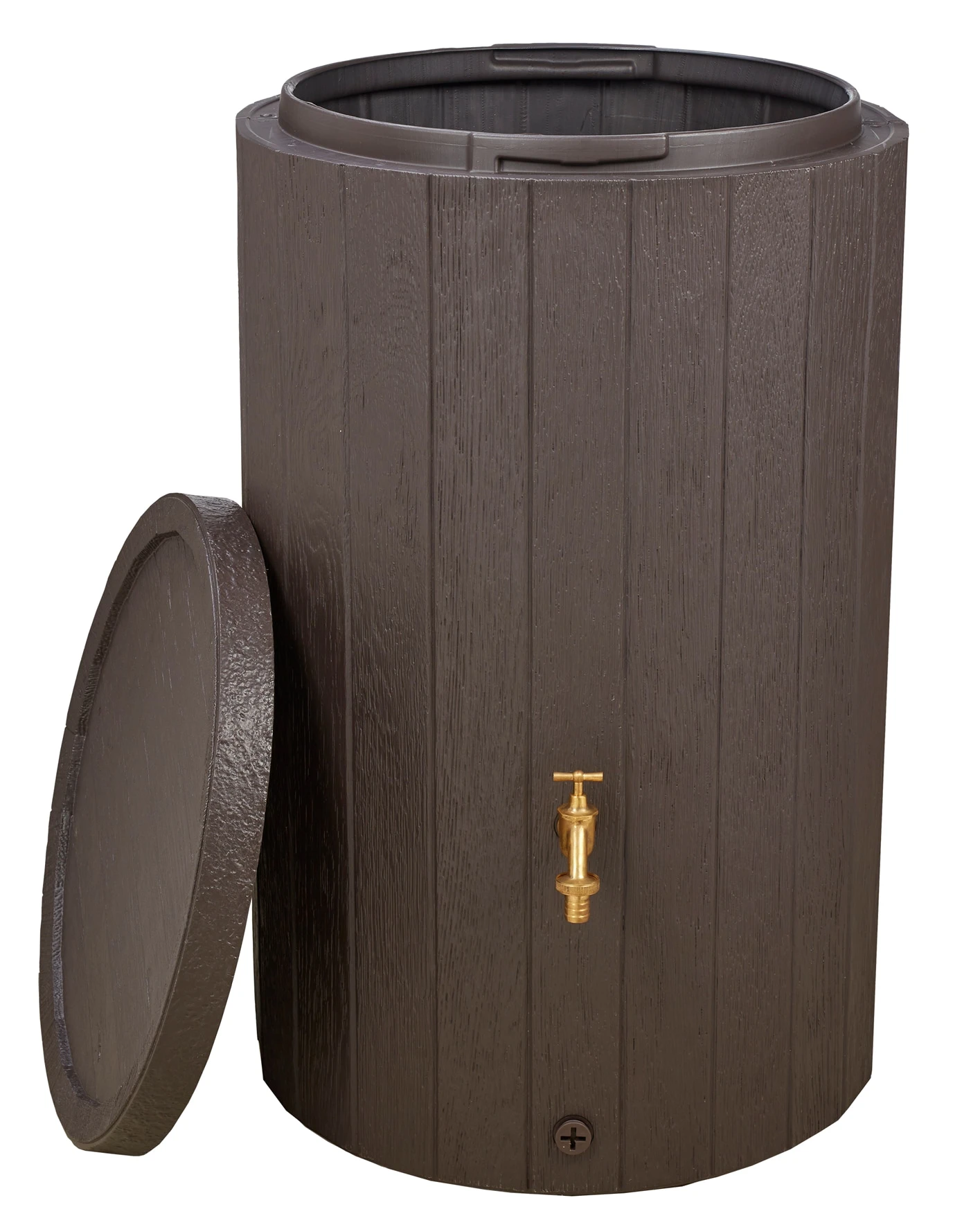 Regenspeicher in Form eines Holzfasses in täuschend echt wirkender und moderner Holzstruktur.