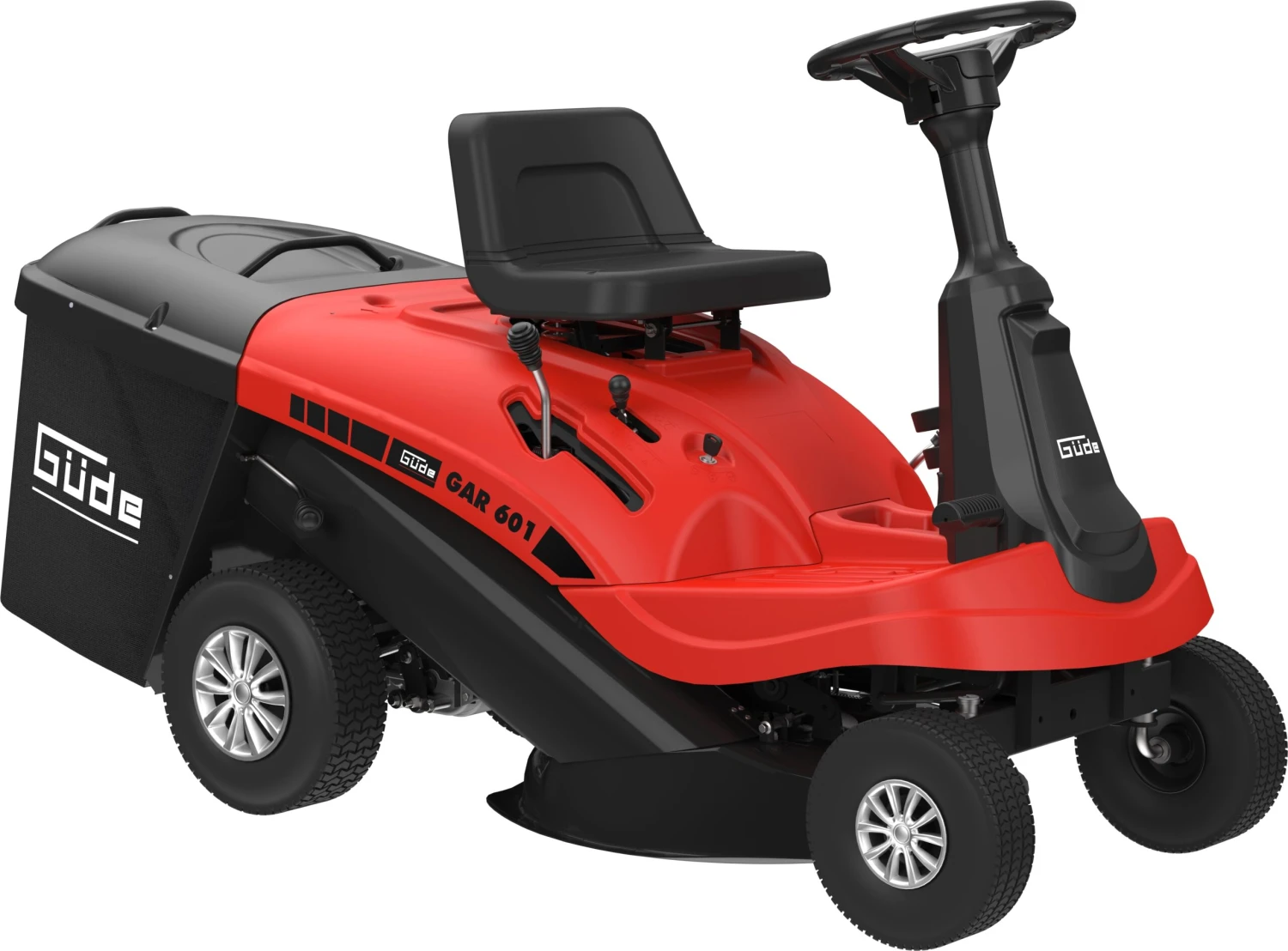 Der Güde Aufsitzrasenmäher GAR 601 meistert Rasenflächen bis zu 3000 m². Dank 150 l Fangsack sind längere Arbeitsphasen garantiert.
