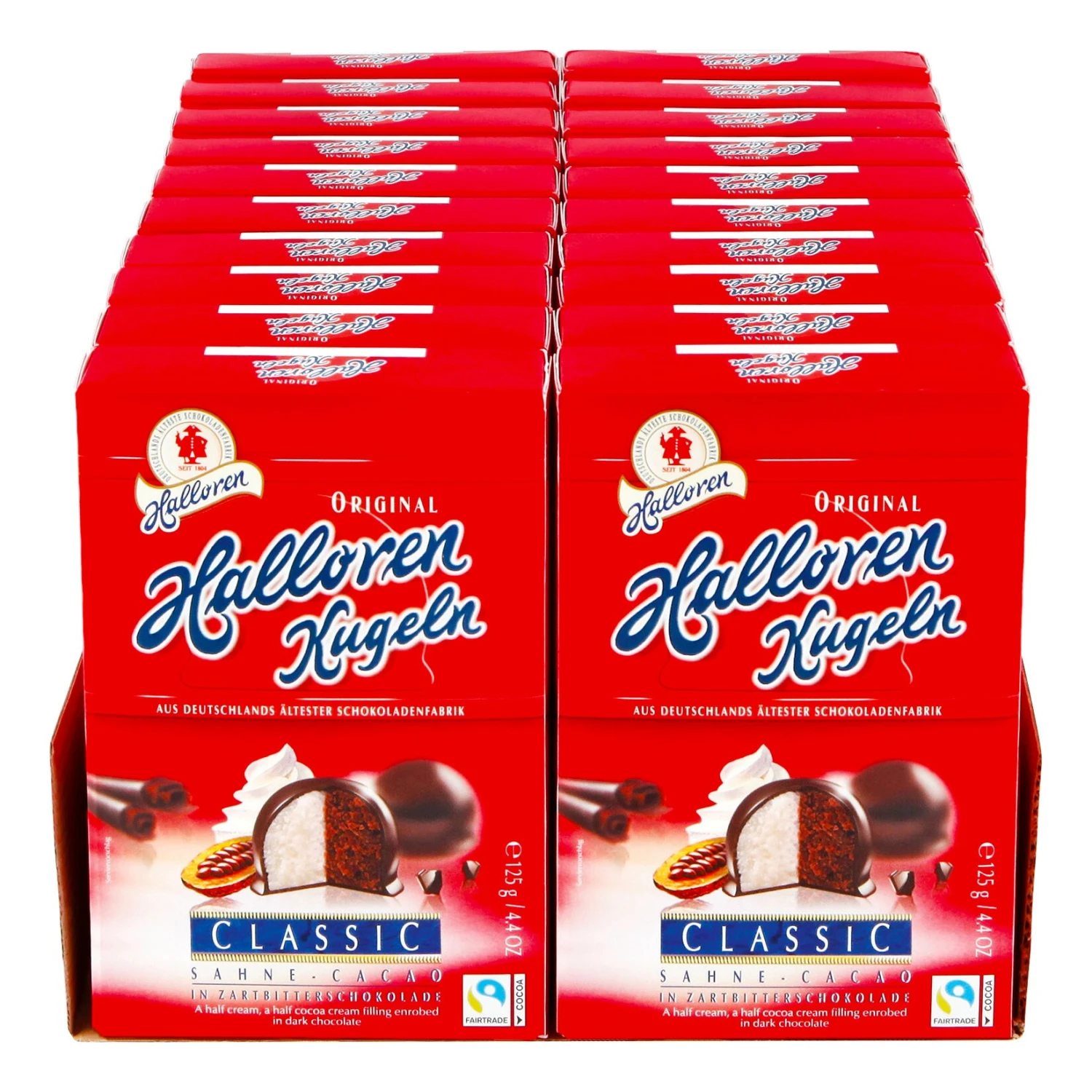 Original Halloren Kugeln mit 83 % Sahne-Cacao-Creme in 17 % Zartbitterschokolade
