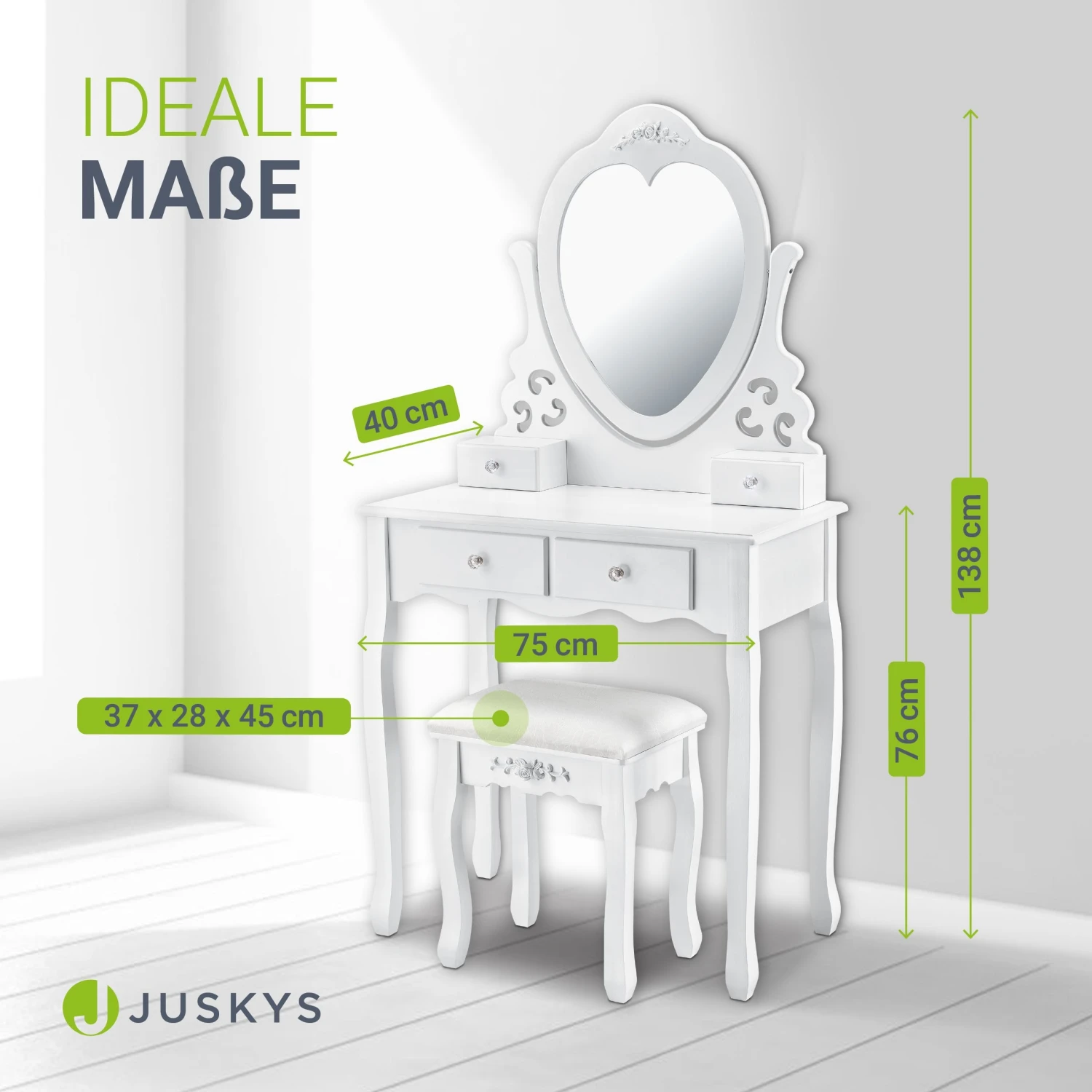 Der liebevoll gefertigte Frisiertisch besteht aus weiß lackiertem MDF Holz. Die solide Verarbeitung bietet einen sicheren Stand und eine lange Lebensdauer. Durch die Lackierung sind die Oberflächen kratzfest und lassen sich leicht reinigen.
