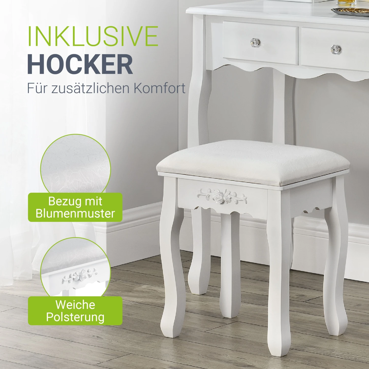 Für zusätzlichen Komfort sorgt ein bequemer Hocker mit dickem Polster. Die weiche Polsterung lässt Sie komfortabel sitzen, sodass Sie sich in aller Ruhe fertig machen können. Der Bezug mit floralem Blumenmuster verleiht dem Stuhl ein romantisches Aussehen.