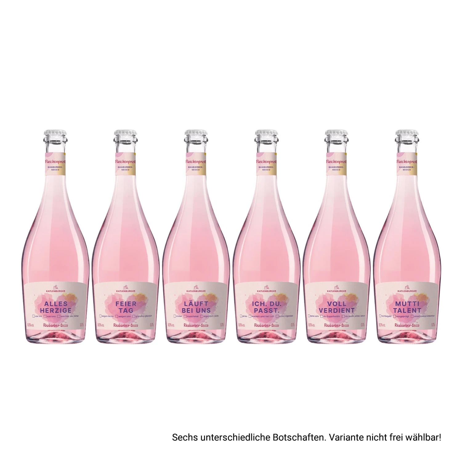 Diesen feinen Rhabarber-Secco schenkt man sehr liebenswerten Menschen oder einfach sich selbst. Sechs unterschiedliche Botschaften können durch die Ankreuzmöglichkeiten auf dem Vorderetikett individualisiert werden. Bestimme einfach selbst, wie emotional du werden möchtest. Und auf dem Rücketikett hast du die Möglichkeit zur namentlichen Personalisierung.