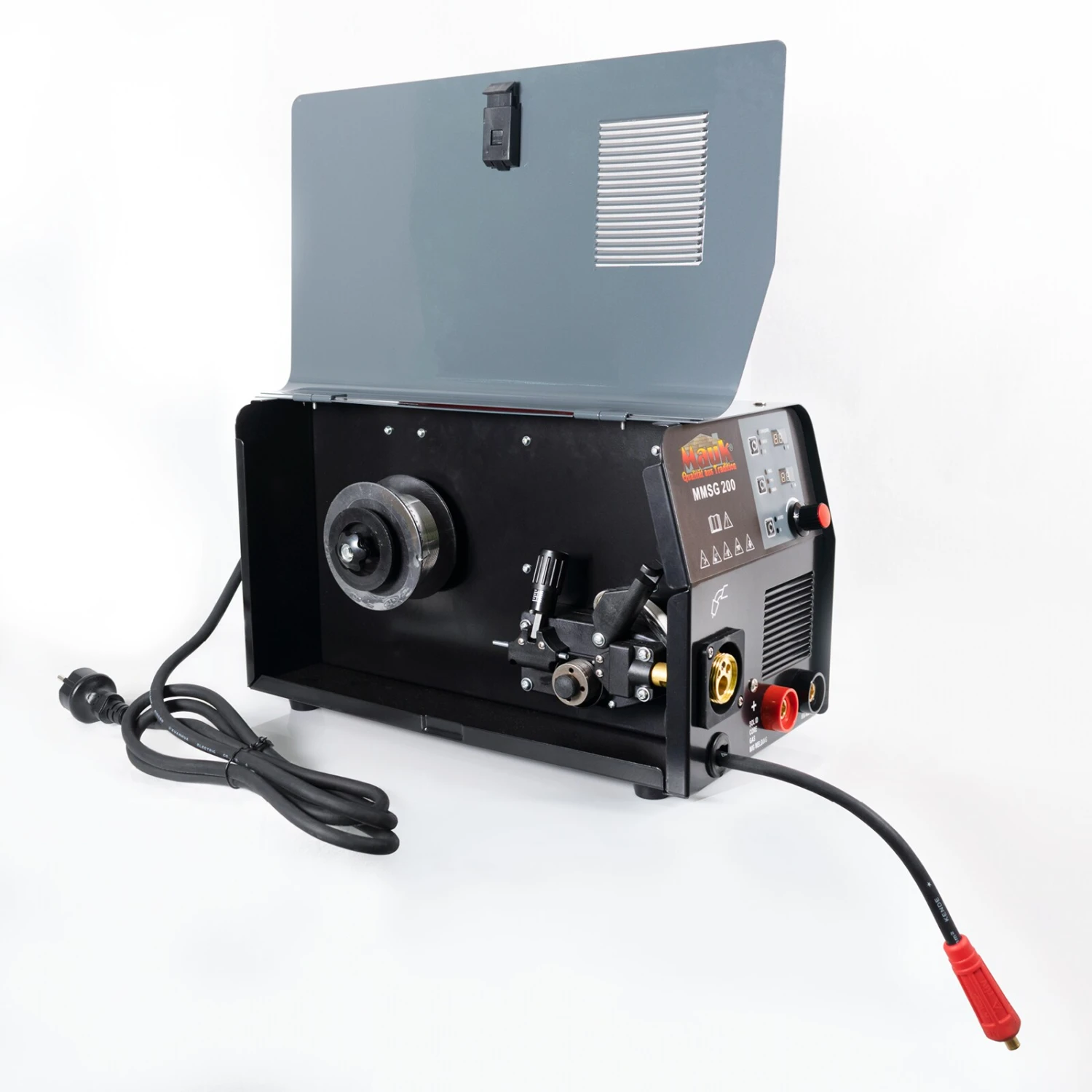 Das Mauk Multischweißgerät MMSG 200 A besitzt eine Intrigierte, automatische Fülldraht Zuführung mit seitlichem Klappdeckelfach.