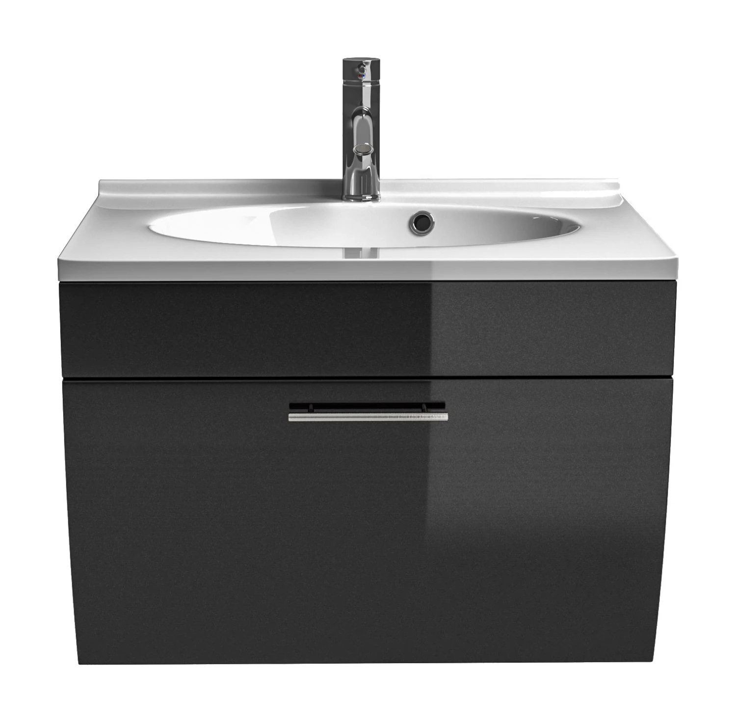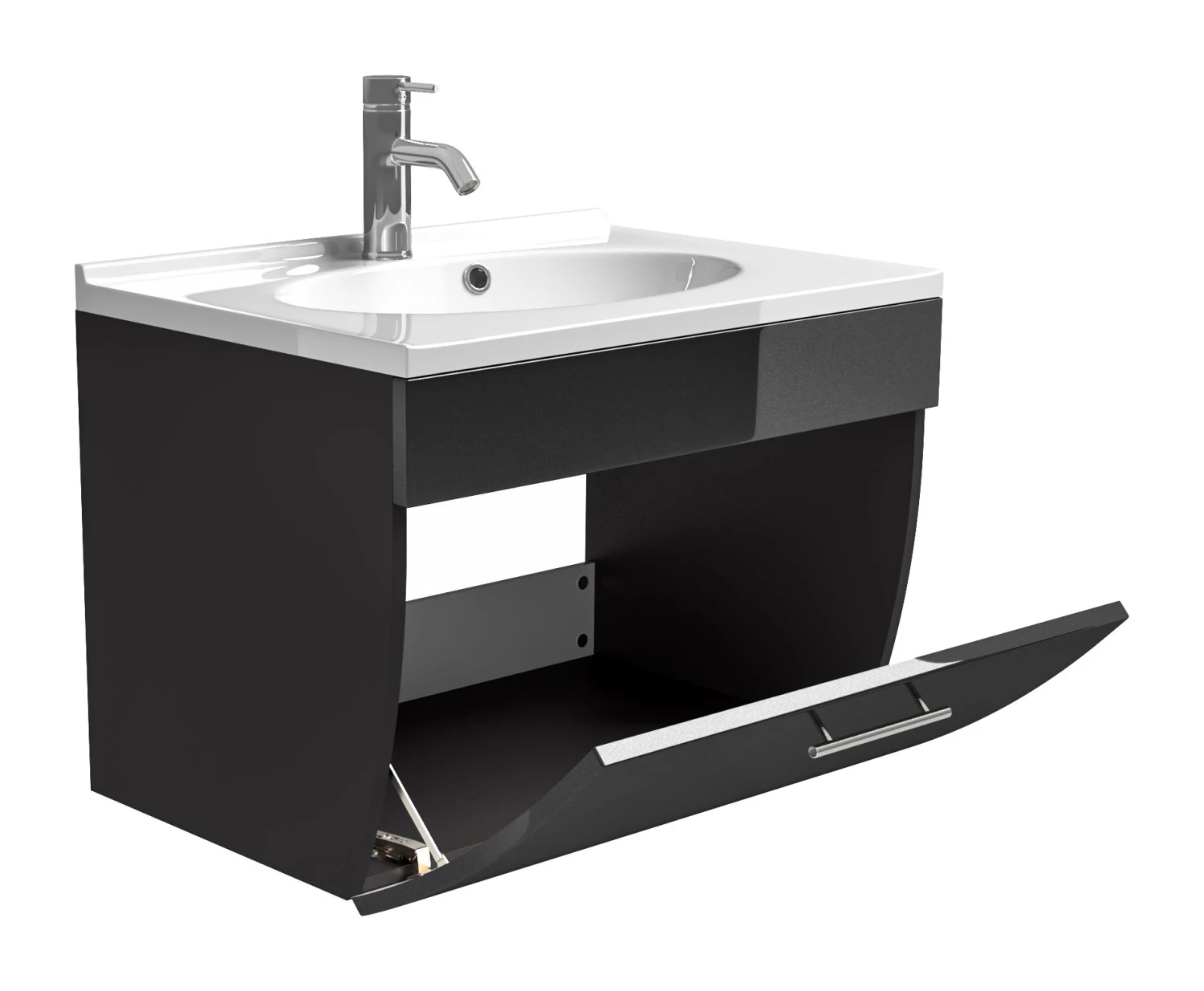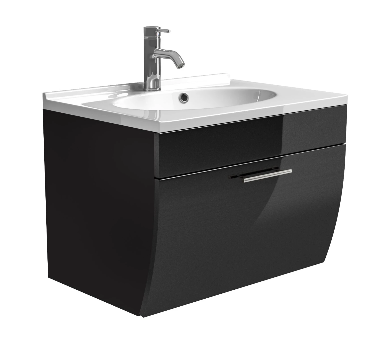 Dieser Waschplatz verfügt über Echtmetallgriffe und bietet durch den geschwungenen Unterbau sowie die hochwertigen Hochglanz MDF-Fronten einen exklusiven Blickfang für Ihr Bad.