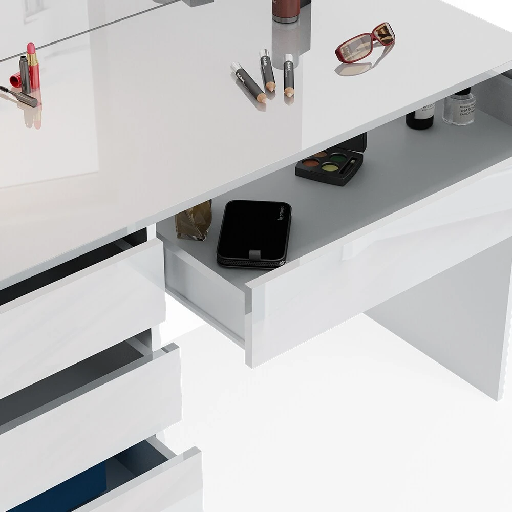 Die gradlinige Optik macht den Schminktisch zu einem stilsicheren Möbelstück, das jeden Raum aufwertet. Hochwertige Verarbeitung, bis hin zum Hochglanzeffekt, runden das Gesamtkunstwerk ab.